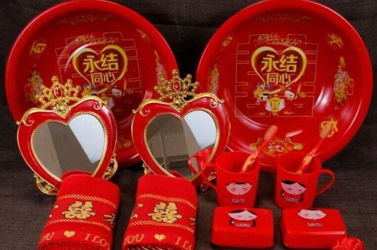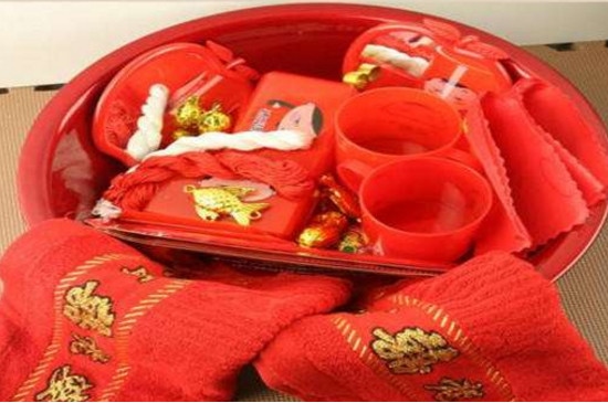 结婚的红盆中需要放洗漱用品,牙刷牙膏、红色镜子、梳子,需要成双成对。另一个红盆中需要放置桂圆、莲子、花生、红枣,表示早生贵子。还需要放置针线盒、香皂盒、线、手工做的面鱼,化妆品和钱,用红布包裹,到婆家再拆开。